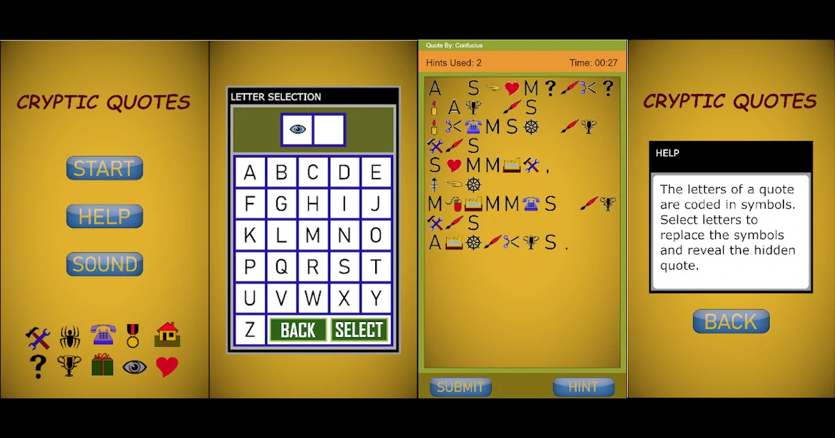 Die Buchstaben eines akzidentiell ausgewählten berühmten Zitats sind in Symbolen kodiert. Ihr Beendigung ist es, die richtigen Buchstaben auszuwählen ansonsten dies versteckte Leitung aufzudecken.